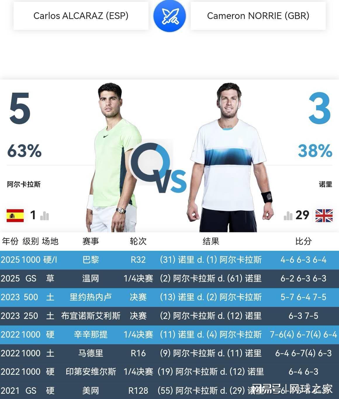 其四、两人最近一次交锋,世界第一阿尔卡拉斯竟被诺里逆转击败,遭遇当头棒喝,获得惨痛教训。2025年巴黎大师赛第二轮,刚在美网夺冠重返世界第一的阿尔卡拉斯,首盘获胜之后竟然连输两盘,惨遭诺里逆转淘汰。这是诺里职业生涯第一次战胜时任世界第一,一举终结了阿尔卡拉斯2025赛季大师赛17连胜、连续九站赛事闯进最后决赛夺取七个冠军的傲人战绩。